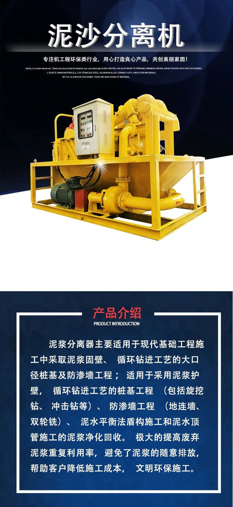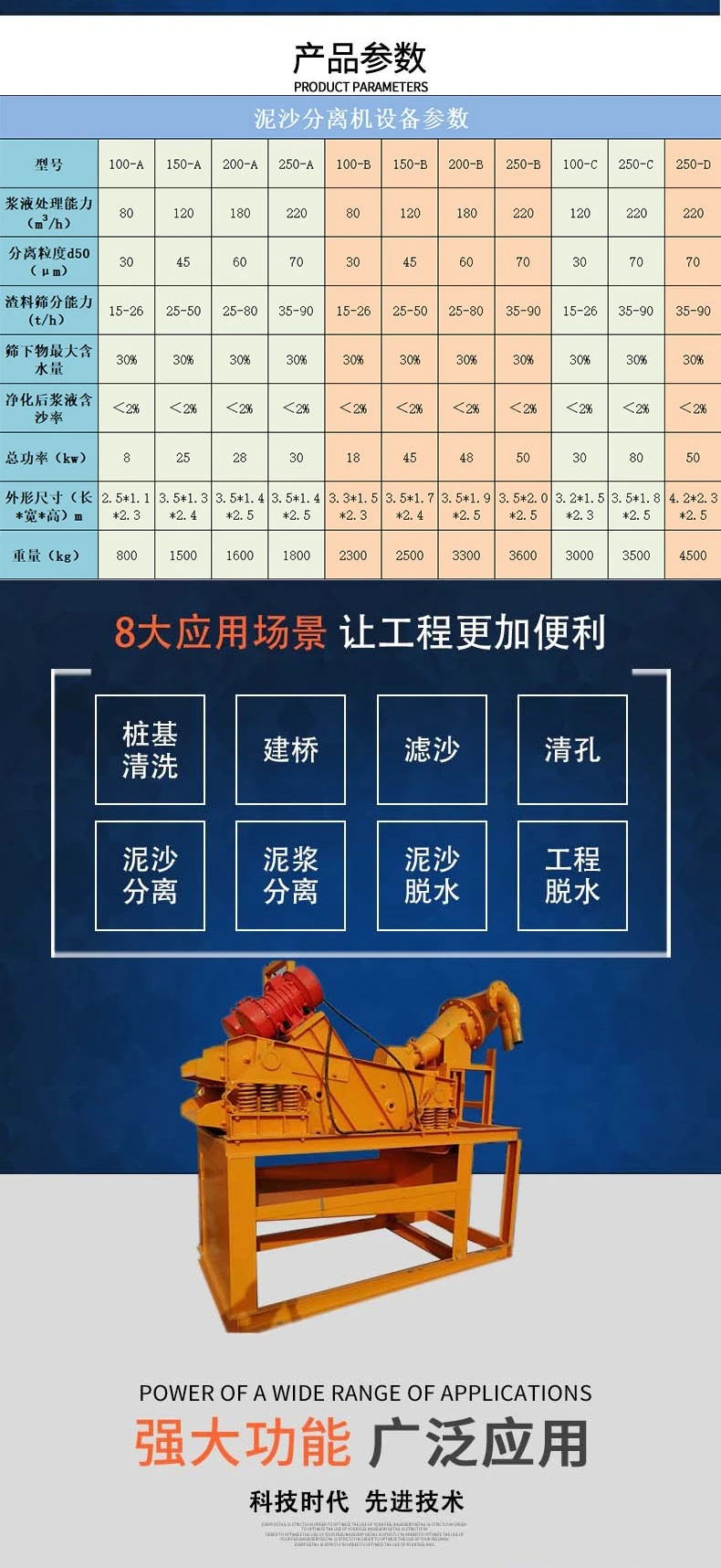 泥浆分离器主要适用于现代基础工程施工中采取泥浆固壁、循环钻进工艺的大口径桩基及防渗墙工程;适用于采用泥浆护壁,循环钻进工艺的桩基工程(包括旋挖钻、冲击钻等)、防渗墙工程(地连墙、双轮铣)、泥水平衡法盾构施工和泥水顶管施工的泥浆净化回收。极大的提高废弃泥浆重复利用率,避免了泥浆的随意排放,帮助客户降低施工成本,文明环保施工。